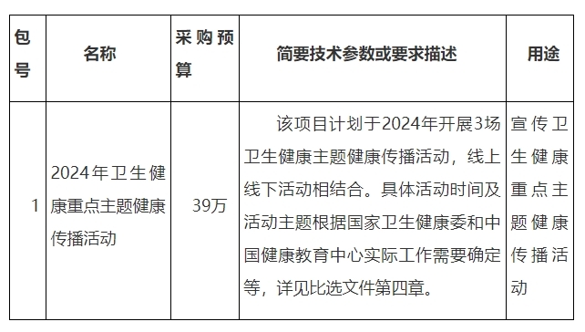 中国健康教育中心“2024年卫生健康重点主题健康传播活动”进行比选采购,现邀请合格供应商参加比选响应。