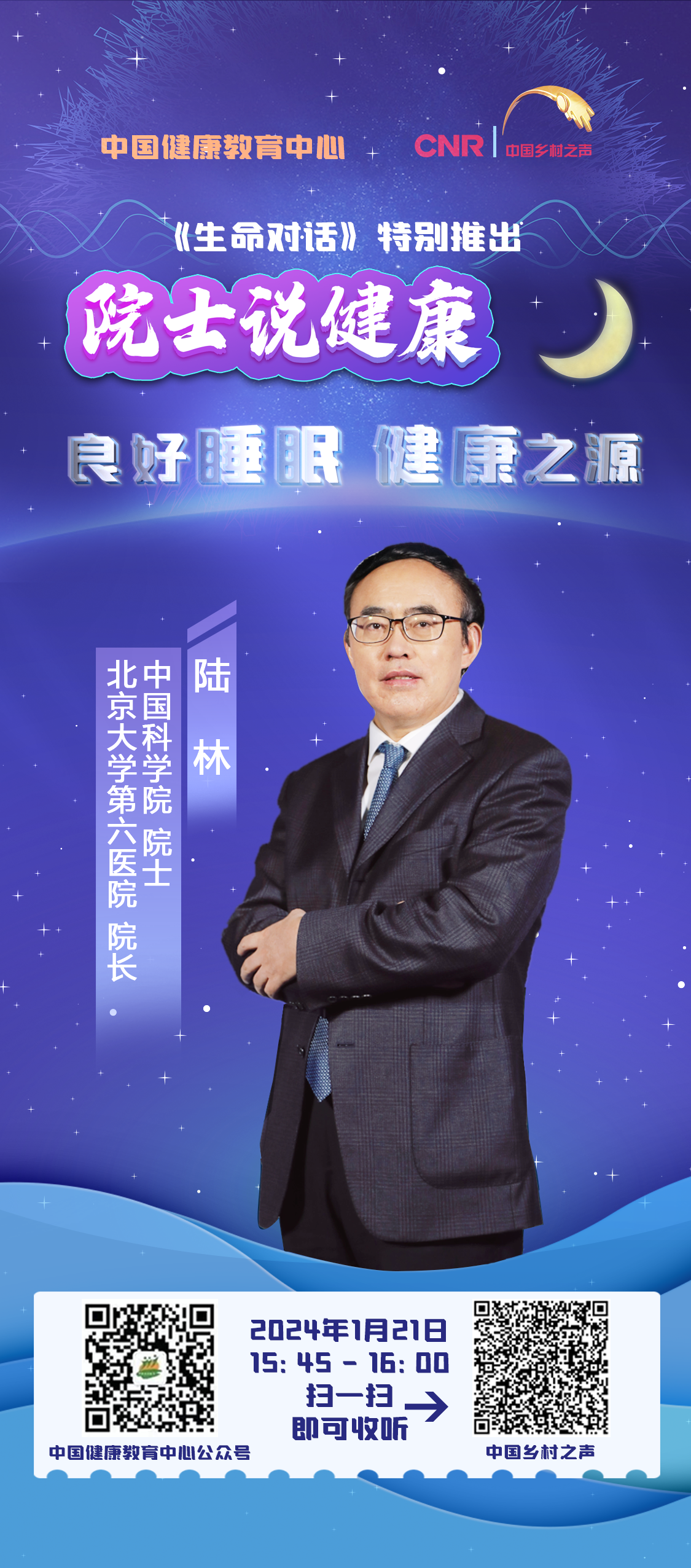 由中国健康教育中心制作的《生命对话》栏目,特别推出《院士说健康》特别节目,邀请中国科学院院士、北京大学第六医院院长陆林院士,为听众带来《良好睡眠 健康之源》,邀请中国工程院院士、首都医科大学副校长、北京脑重大疾病研究院院长吉训明院士,为听众带来《脑卒中 精准防控进行时》,欢迎收听。